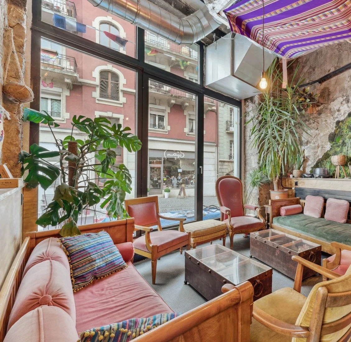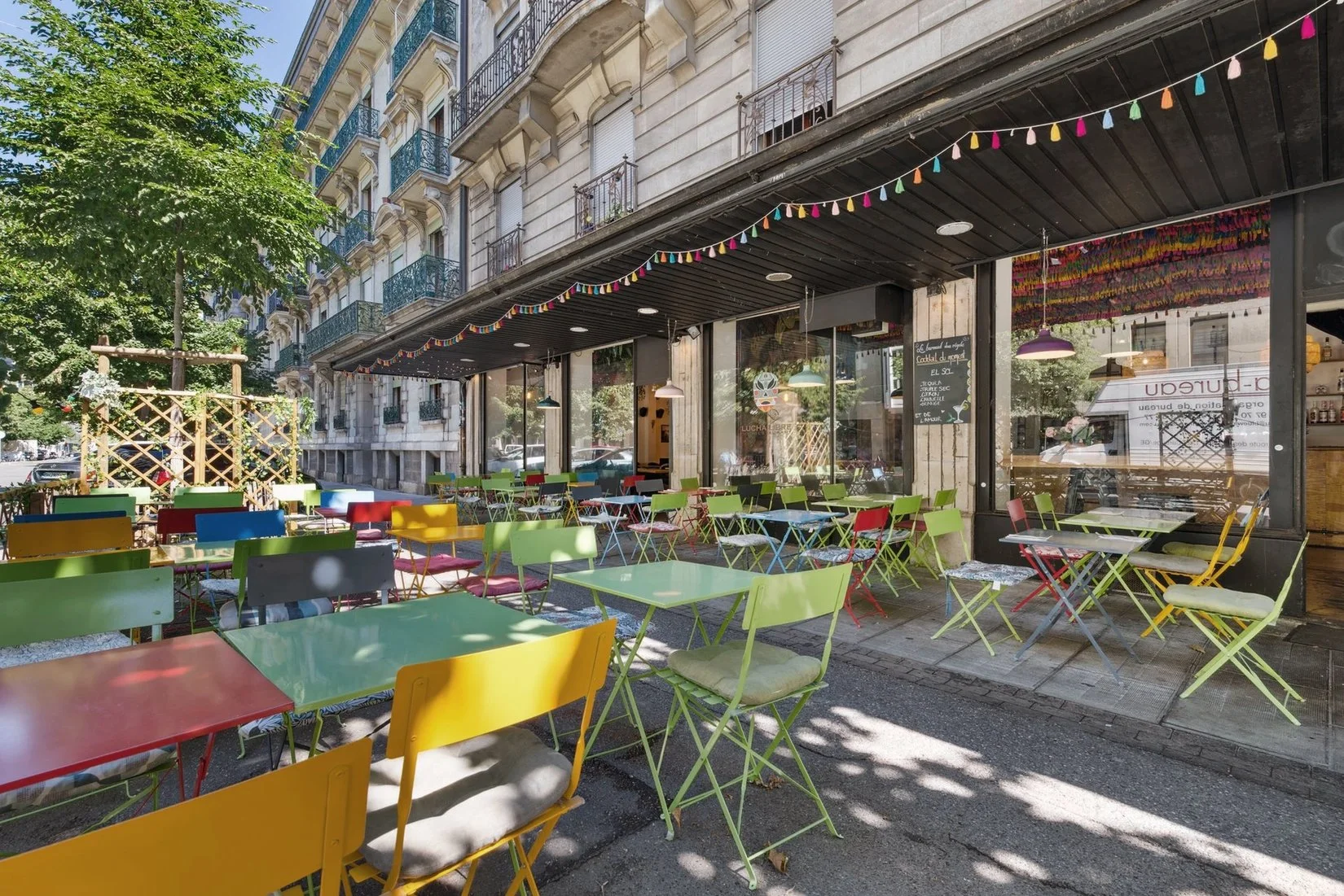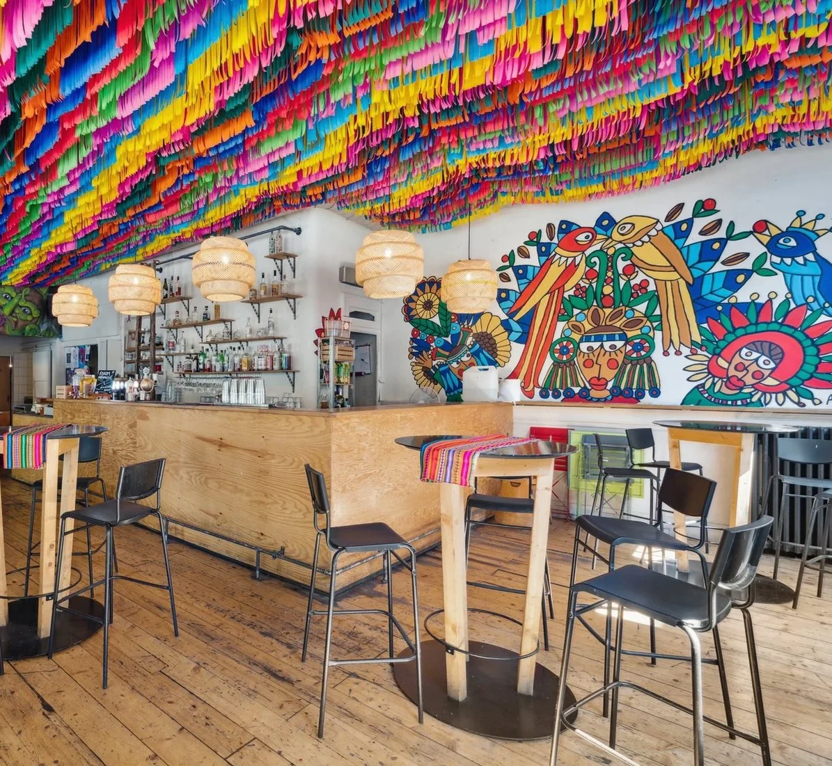 Situé dans le centre de Genève, en face d’UNI MAIL le restaurant est situé dans l’angle d’un bâtiment historique. Cousin du Lucha Libre à Lausanne, l’identité visuelle et les principes d’autoconstruction restent les mêmes. Le mot d’ordre: minimum d’investissement pour un maximum d’effet. Le décor du plafond souligne cet impératif. S’étalant sur tout l’étage, les bandes colorées en papier crépons évoquent les décorations des piñatas d’Amérique Centrale dont le restaurant promeut la cuisine. Le foisonnement visuel, ici encore accentué par les fresques murales, est contrebalancé par la sobriété du pin maritime et le crépis blanc des murs.