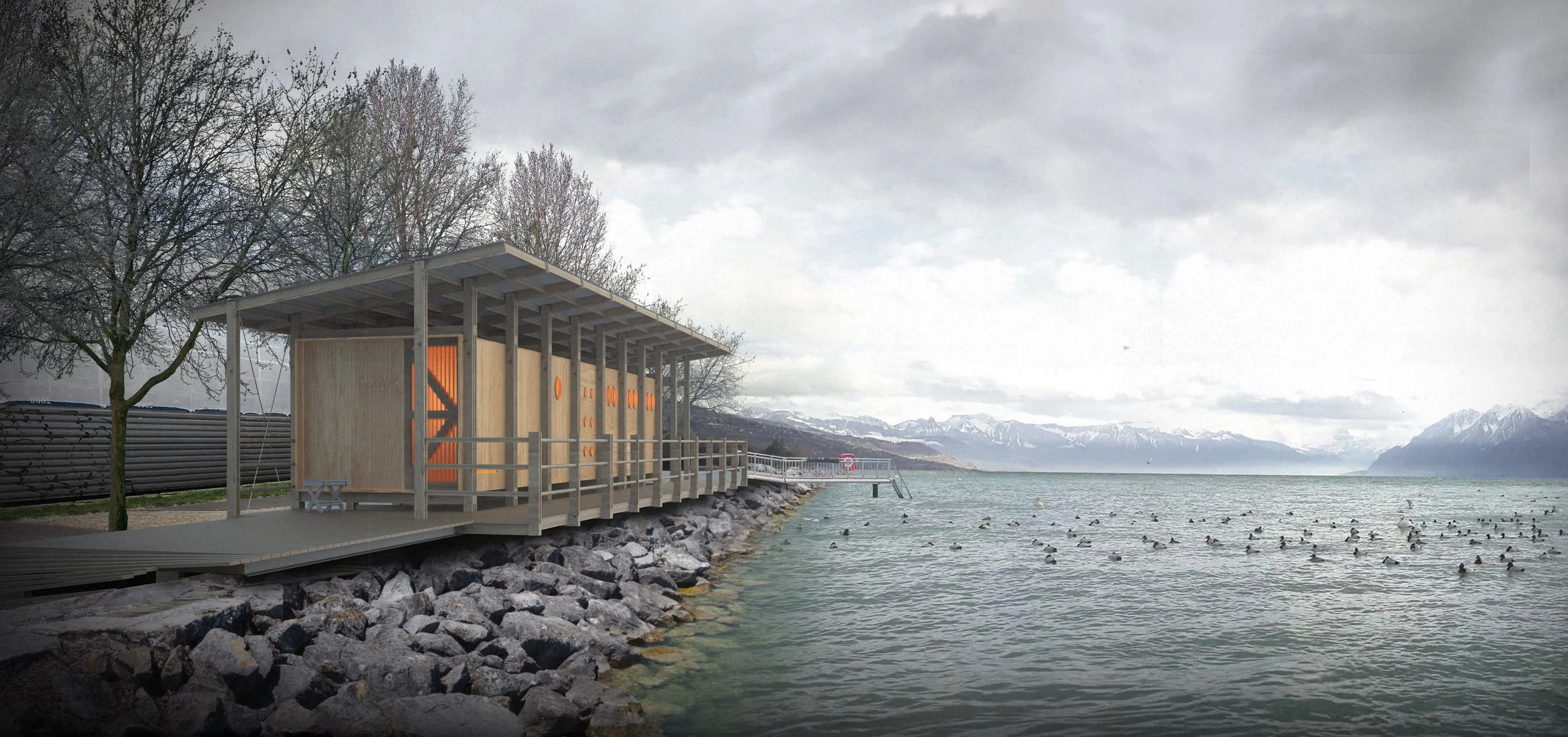 Les Lausannois ont un attachement particulier au lac Léman. Le bord du lac est pourtant peu aménagé et fréquenté, spécialement en hiver. Avec cette proposition que nous avons développé avec l’association ilake Lausanne, l’objectif était de créer une structure temporaire qui s’intégrerait dans le deck de la jetée de la compagnie. Le programme du sauna au bord du lac, éprouvé dans de nombreuses villes suisse alémaniques amène un point d’intérêt et une interface pour l’appropriation publique d’un espace peut considéré jusqu’alors.