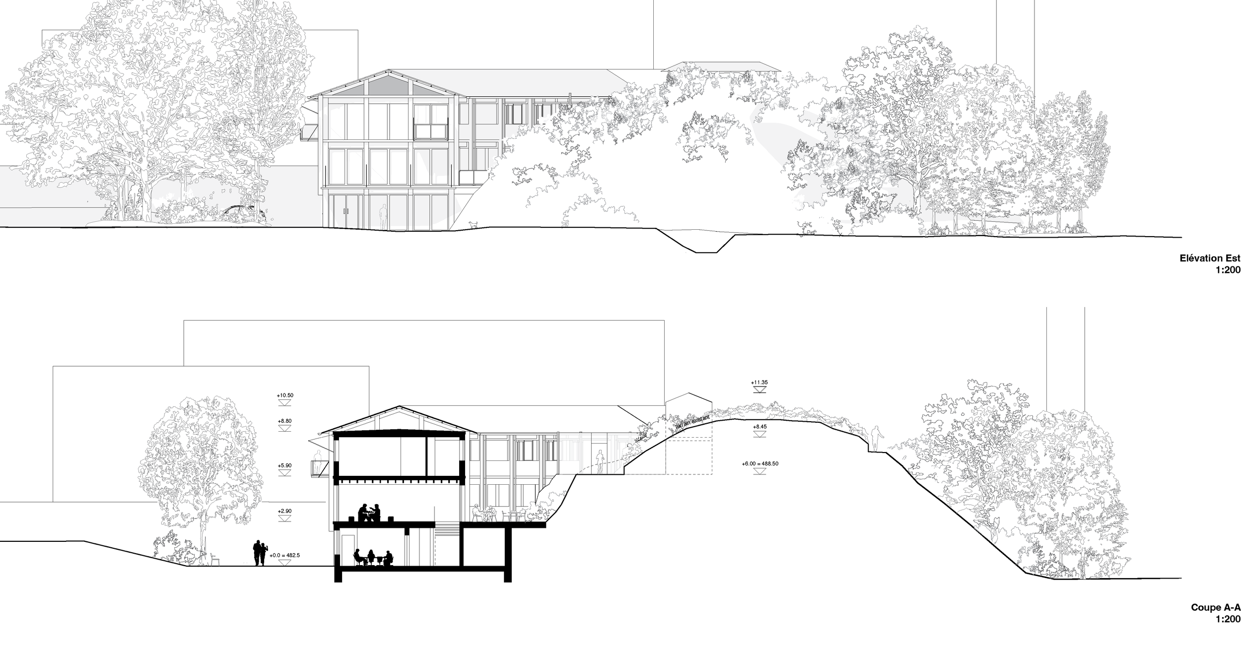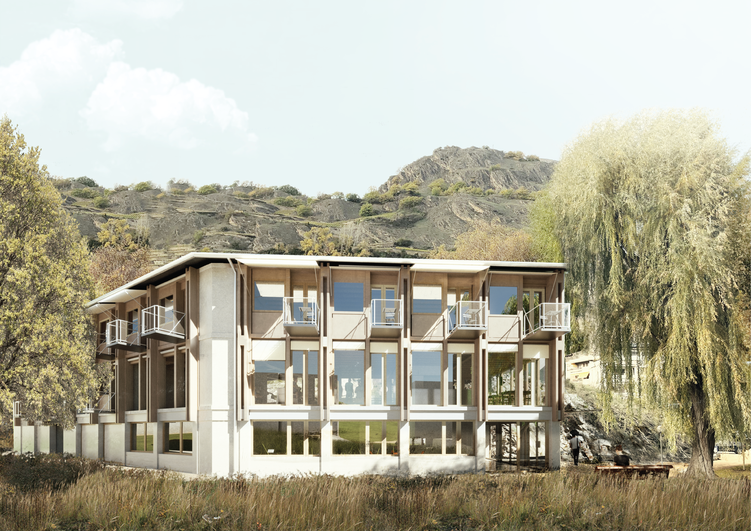 La synthèse des valeurs du foyer a formé la colonne vertébrale de nos réflexions. Elle souligne l'aspect multi-facette nécessaire à l'accompagnement offert par les éducateurs; autonomie personnelle, vie collective, formation professionnelle et temps libre participent de concert à la réinsertion sociale des jeunes. Nous avons souhaité inclure ces axes dans notre proposition. Lové contre la colline, le projet offre une façade ouverte sur l’extérieur au sud et une vue contemplative sur la végétation et la roche au nord. À travers ses trois étages il incarne la pluralité des approches offertes par le foyer.