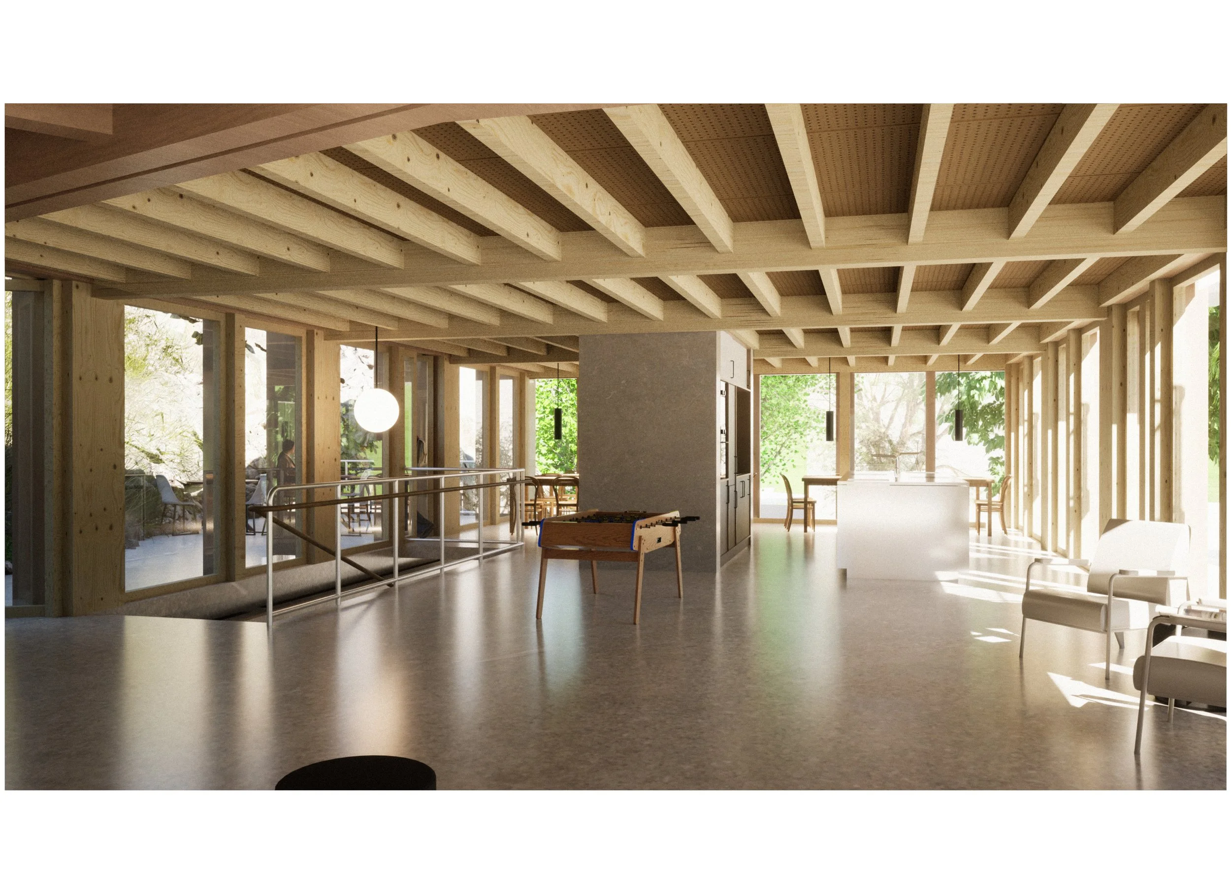Entre ces étages de pierre et de bois se trouve un espace hybride. Il est le lieu privilégié de la vie collective et du développement personnel. C’est un plan libre qui offre une grande flexibilité dans l’organisation d’activités éducatives. Les espaces connectés ainsi que les larges façades vitrées offrent des échappées visuelles qui réduisent le sentiment d’enfermement. A l’est, la zone communautaire est traversante et étend son espace sur la terrasse qui communique avec la colline. Une cuisine ouverte avec îlot et la salle à manger sont idéalement orientés pour le déjeuner. À l’ouest, les espaces pédagogiques profitent des dernières lueurs pour des cours du soir ainsi que du dégagement sur la parcelle boisée voisine. Le sol d’aspect minéral et la charpente du plafond caractérisent l’espace, entre rigueur et familiarité.